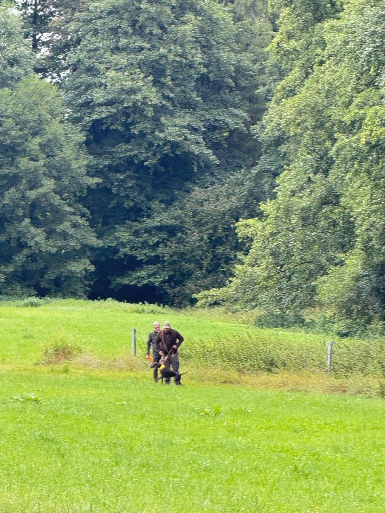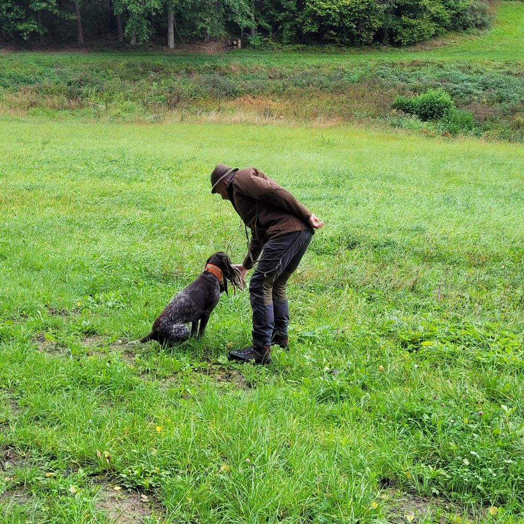 Nach den Schleppen ging es zu den Suchen. Aufgrund der Nässe war es schon zu befürchten, dass sich Hase und Fasan in den noch in großen Flächen stehenden Mais verschlagen hatten. Einen richtigen Regenguß pausierten Führer und Richter – das musste ja nicht sein! Wir hatten mit drei Hunden alle Zeit der Welt. Die Suchengänge waren bei zwei Gespannen etwas verhalten – zu kurz, nicht planmäßig genug. Vielleicht dem Wetter geschuldet? Die dritte Hündin legte eine äußerst flotte, jedoch planmäßige Suche hin.