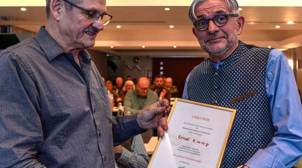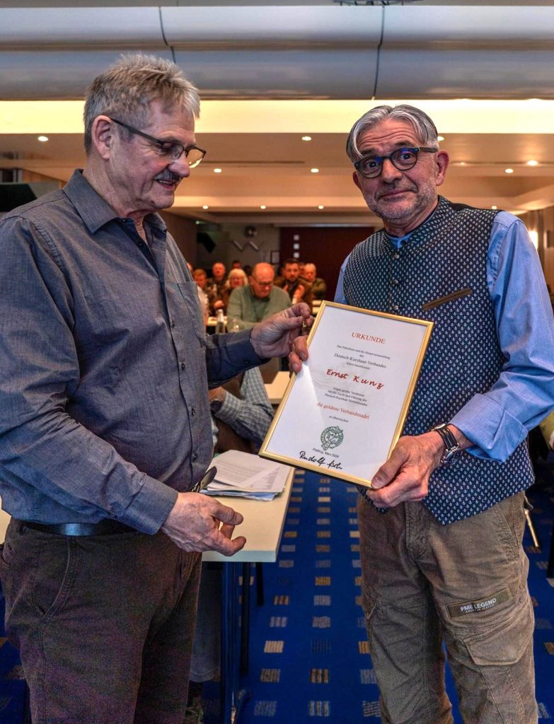 Anlässich der Jahreshauptversammlung des Deutsch-Kurzhaar-Verbandes in Fulda erhielt Herr Ernst Kunz – langjähriges Mitglied, oft eingesetzter fachkundiger Richter, Spezialzuchtrichter, mehrfacher Referent unserer Richterschulungen und ebenso langjähriger Gönner des DK Franken die “goldene Verbandsnadel” durch den Präsidenten Rudolf Fisch überreicht.
