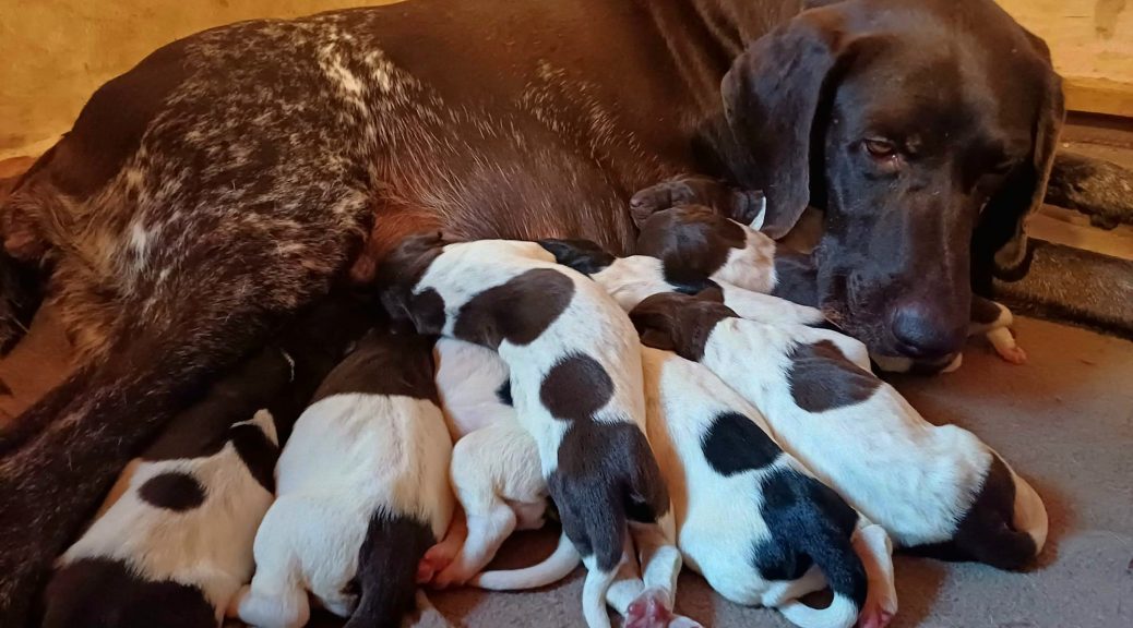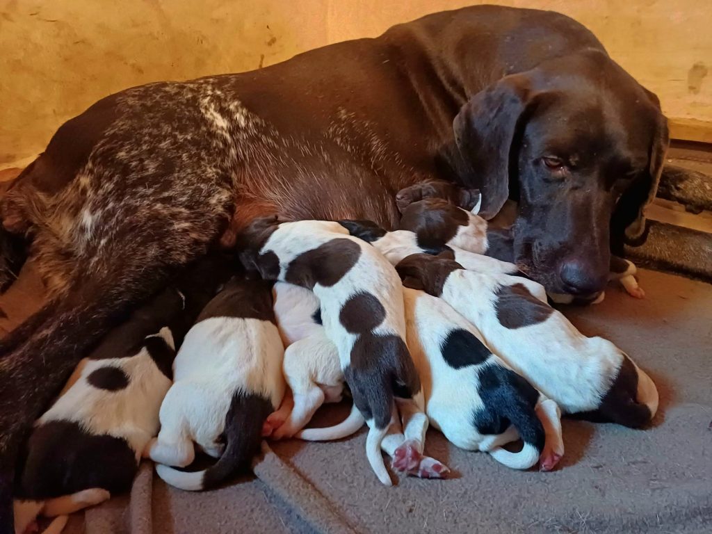 Am 01.04.2026 ist mit neun munteren, kräftigen Welpen unser C-Wurf gefallen. Er teilt sich auf in 3 Rüden (2 brschl., 1 schwschl.) und 6 Hündinnen (2 schwschl., 4 brschl.) aus