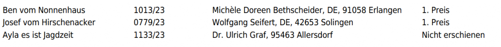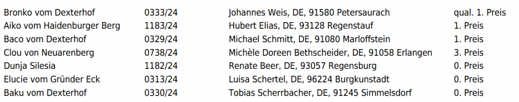 Amanda von der Grafsau 1221/24 Georg Sippl 2. Preis Afra von der Grafsau 1219/24 Manfred Kronast 2. Preis Anton von der Grafsau 1217/24 Dr. Anna Dettendorfer 0. Preis Zia vom Mausberg 0487/24 Sebastian Schindler Nicht erschienen
