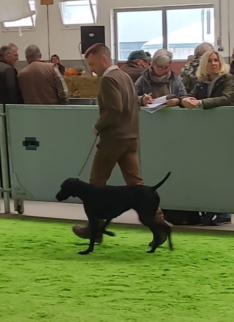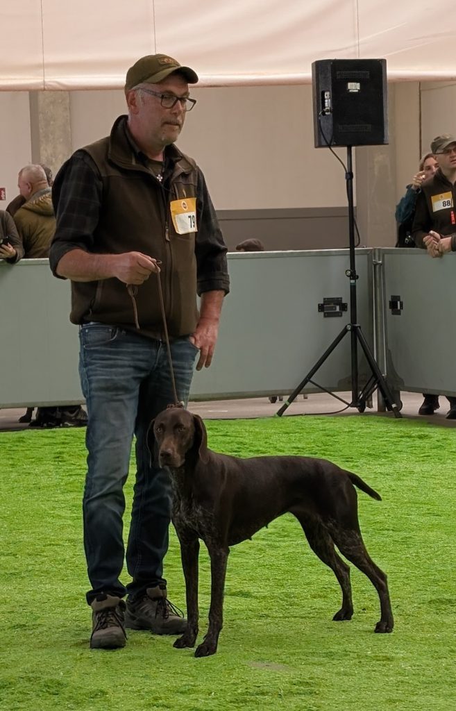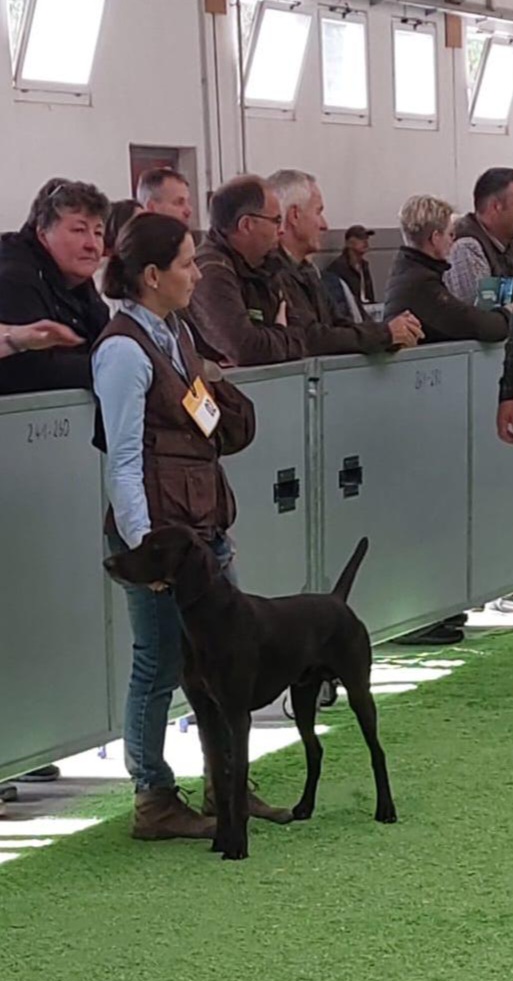Bei leichtem Wind ca. 10%, plus 2 Grad und gutem Wetter, zeigt die Hündin auf einer Streuwiese umrahmt von Wildhecken eine hochkonzentrierte Quersuche mit ausdrucksvollem Markieren der Wildbewegungen der vergangenen Nacht im angepasstem Suchentempo. Sie erarbeitet für ihre Führerin eine Übersicht der Wildspuren, die den hohen Wildbesatz erkennen ließ. Unter mehrfachem Vorstehen am Hasen und Fasan, gelingt ein sicheres Anziehen am Fasan, bei dem Schussruhe am Federwild festgestellt werden kann. Beim Hasen bestätigt sie dies mit gelassener Ruhe. Die Hündin am Wasser geschnallt, nimmt auf einmaligen Befehl die Wasserfläche an und zeigt eine weiträumige Stöbersuche. Am Einlassufer beginnend, quert sie zeitnah, sucht in hohem Tempo das Gegenufer ab, taucht mit rascher Wendung ins Schilf und macht dort sehr zügig eine Ente hoch, die seitlich abstreicht. Sie setzte flüssig ihre Suche fort, kommt auf eine 2. Ente, die hochsteigt. Energisch nimm sie das tiefere Schilf an, bis der angeordnete Abruf sie zur Führerin zurück kehren läßt. Die anschließend geworfene Ente wird mit sofortigem Apport quittiert, ihre Schussruhe am Wasser ist klar, das Bringen korrekt. Die Verlorensuche einer Ente erfolgt mit sicherem Finden und einwandfreiem bringen. Lotte erfreut die Richter während der Prüfung mit Ruhe, Konzentration und Jagdinstinkt, eine wesensstarke Partnerin ihrer Führerin.