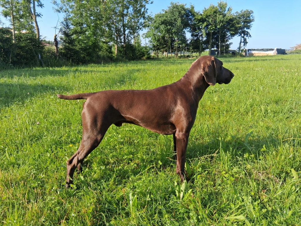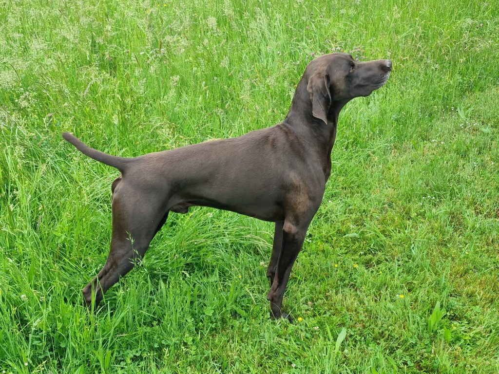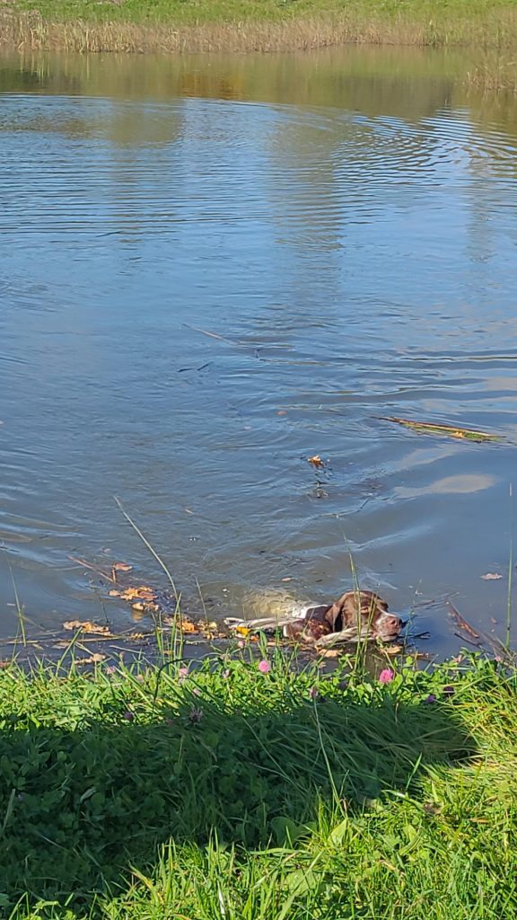 Chronos suchte flott und weiträumig, zeigte eine schöne Quersuche und reagierte auf Pfiff und Zeichen. Er suchte oft mit etwas tiefer Nase, stand öfters ohne Wild vor, wartete aber bis die Führerin kam. Im 2. Gang stand er kurz einen Hasen vor; bei Schuss Gehorsam. Wir mussten dann zum Wasser. Wasser: Hier nahm er gleich das Wasser an, schwamm am Ufer entlang. Die Ente flog auf das offene Wasser. Das Bringen und Ausgeben waren sehr gut. Feld: Bei der Quersuche zeigte er wieder eine sehr gute Arbeit, stieß aber bei gutem Wind Hasen heraus ohne vorzustehen; einen weiteren markierte er kurz. Verlorensuchen alles sehr gut