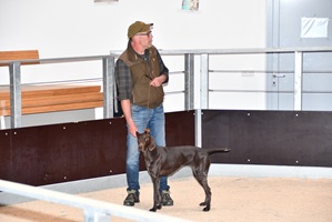Der Rüde nahm sofort das Wasser an und stöberte anhaltend die Schilfpartie durch. Da die Ente immer wieder wegtauchte und nicht erlegt werden konnte wurde dem Rüden eine tote Ente ins Wasser geworfen (mit Schussabgabe). Die Ente wurde dem Führer korrekt zugetragen. In allen Suchengängen zeigte der Rüde eine raumgreifende Suche mit sehr gutem Suchenstil. Er kommt hierbei mehrmals an Fasanen und Hasen zum Vorstehen und zeigte bei abstreichendem und ablaufendem Wild mit Schussabgabe korrektes Verhalten. Das Bringen aus der Deckung wurde sauber erledigt. Eine abgerundete Feldarbeit. Bester Hund in der Gruppe