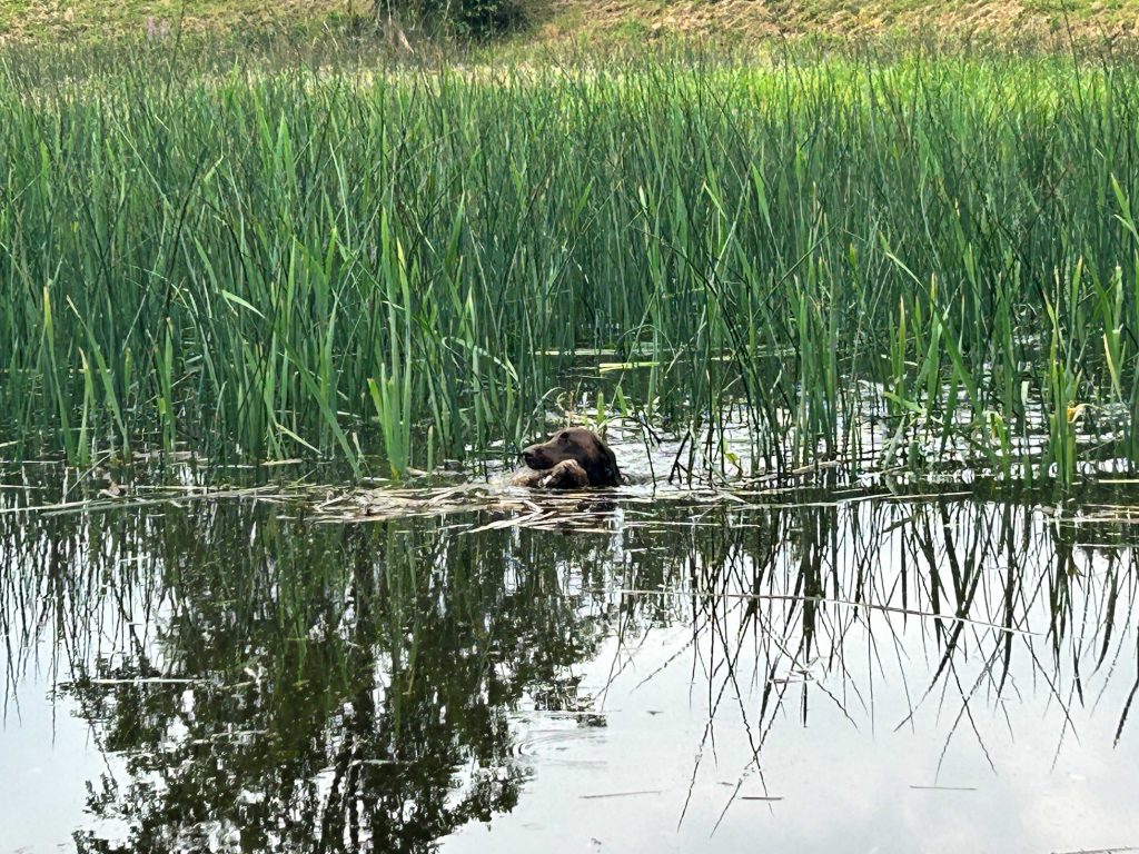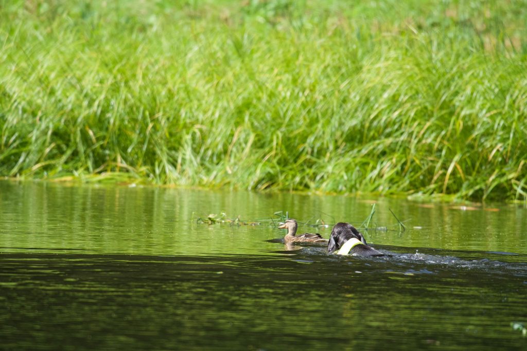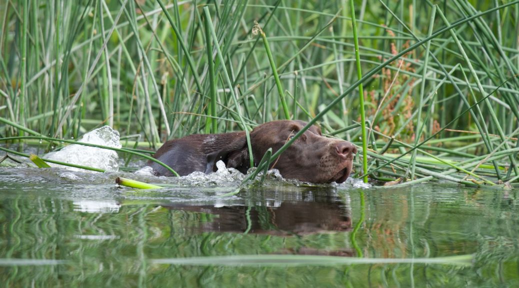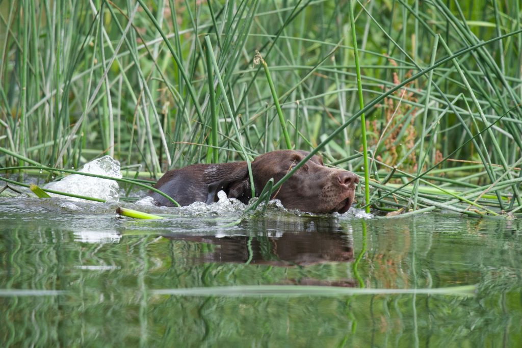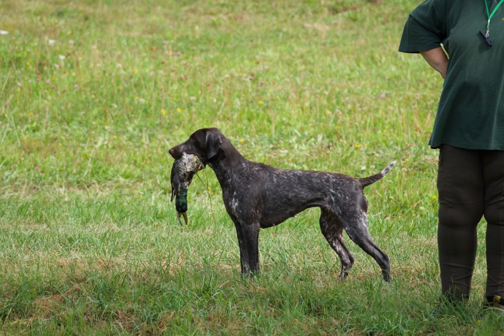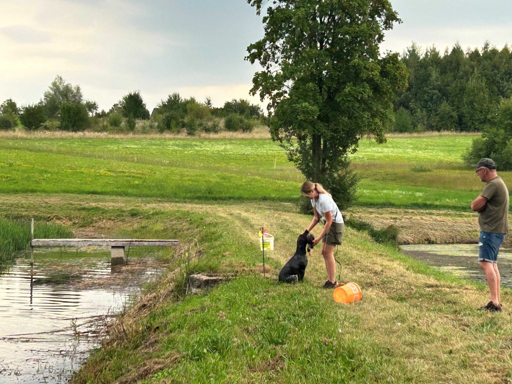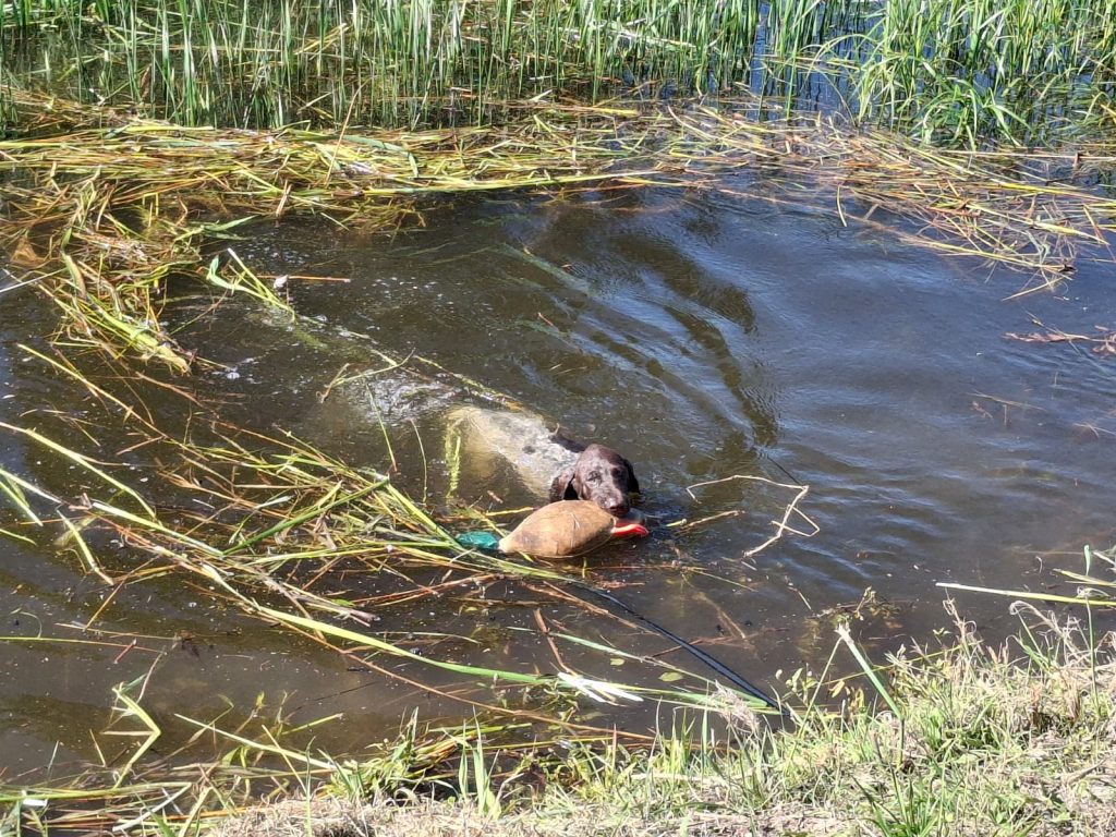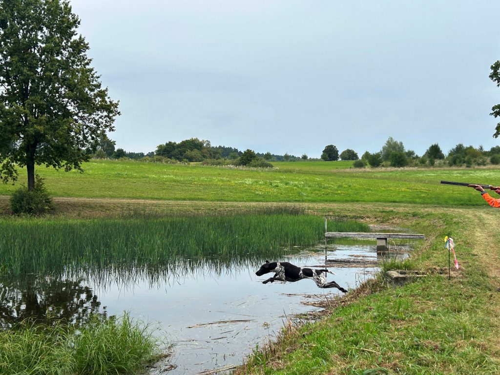 Schussfestigkeit am Wasser, Verlorensuchen im deckungsreichen Gewässer und Stöbern mit Ente im deckungsreichen Gewässer standen auf dem Programm.